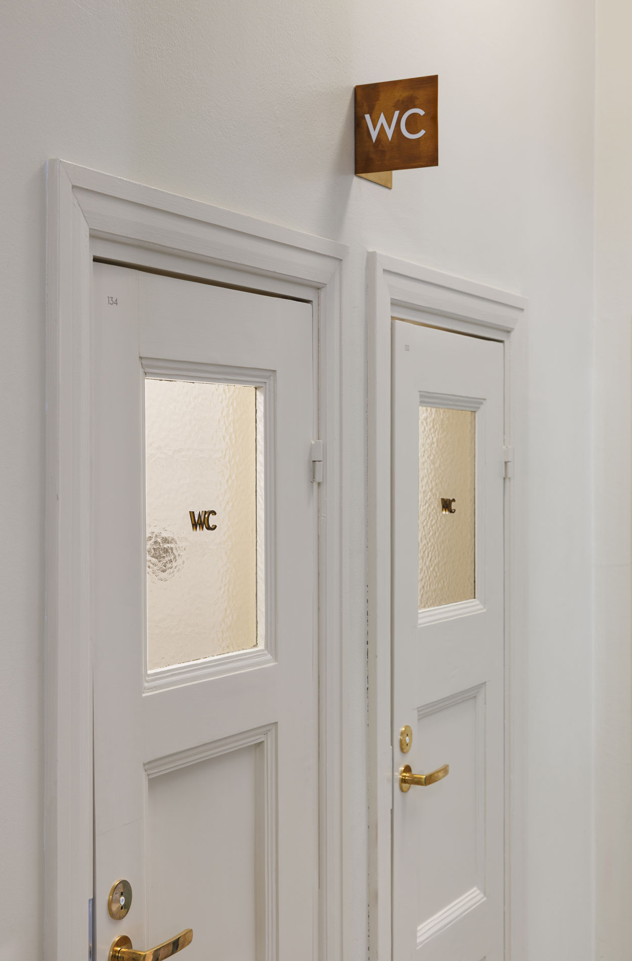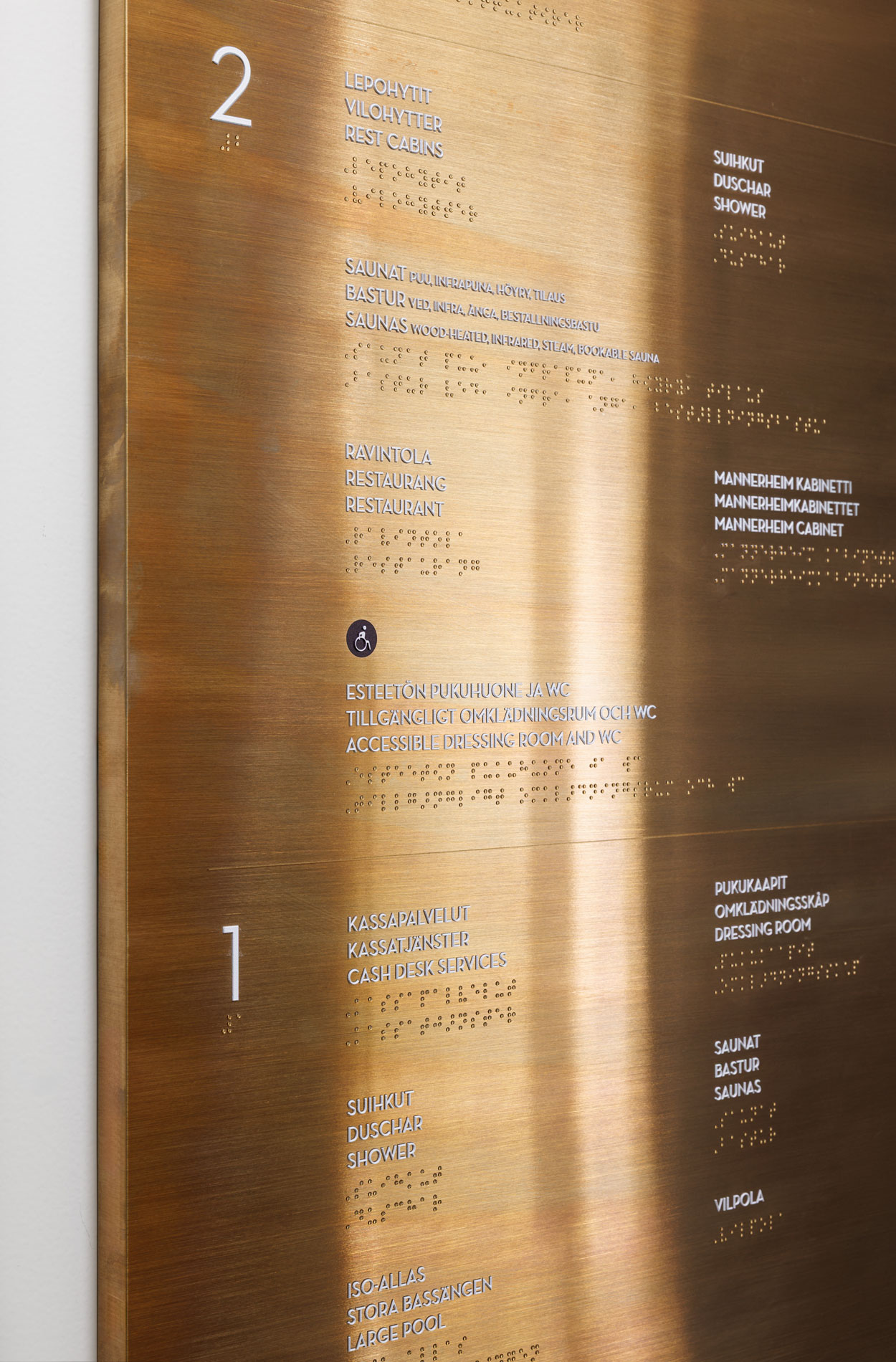 The materials selected for the signs were high-quality antique brass and curly birch, respecting the architecture. The content of the signage was implemented with embossed letters and braille to ensure that visiting the swimming hall is as simple and accessible as possible for everyone.