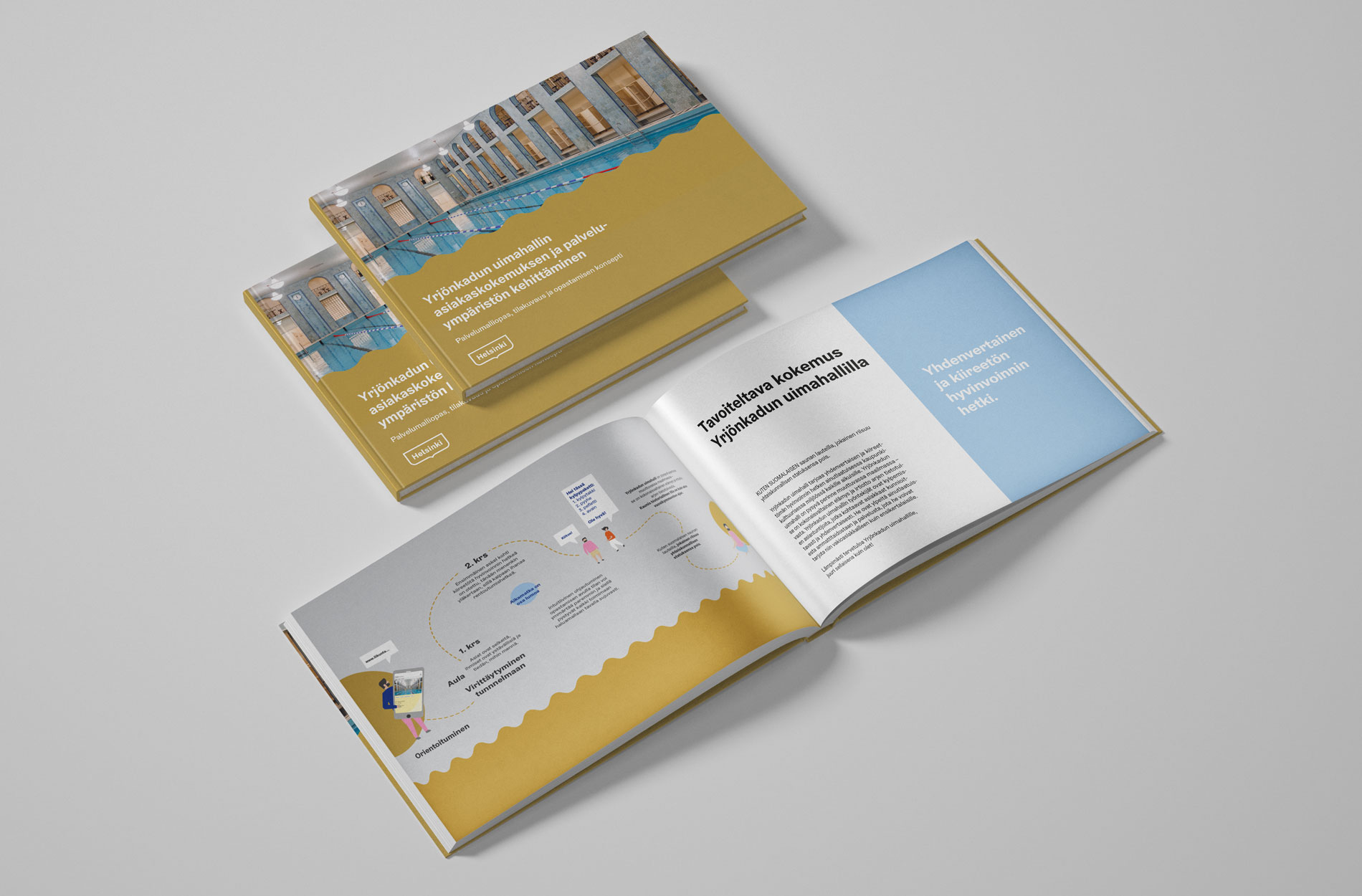 Rune & Berg Designin suunnittelema Yrjönkadun Uimahallin palvelumalliopas, tila- ja opastesuunnittelu, uimahallin visuaalinen identiteetti sekä viestintäkanavamalli.