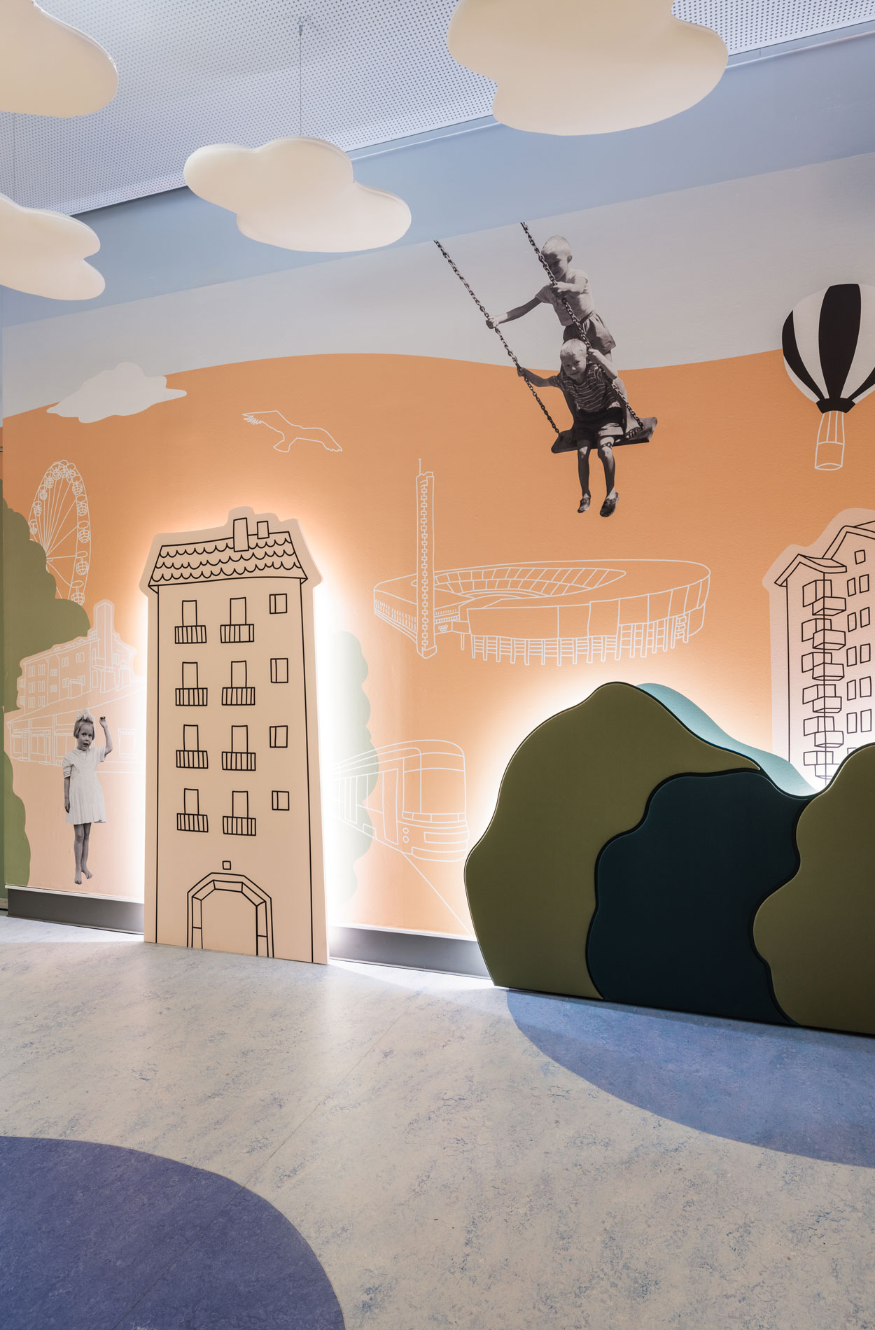 Entinen “Aikakone”-näyttelytila sai uuden käyttötarkoituksen lasten pukeutumistilana ja varastona. Seinäkuvituksiin tuotiin helsinkiläisille lapsille tuttuja, arkisia asioita. Ilmeeltään tila linkittyy museon Lasten kaupunki -näyttelyyn.