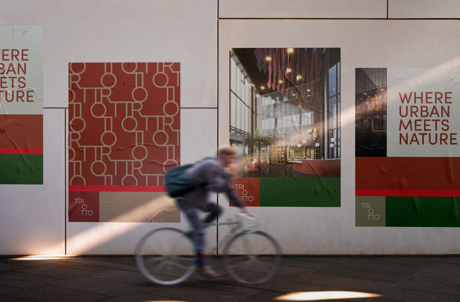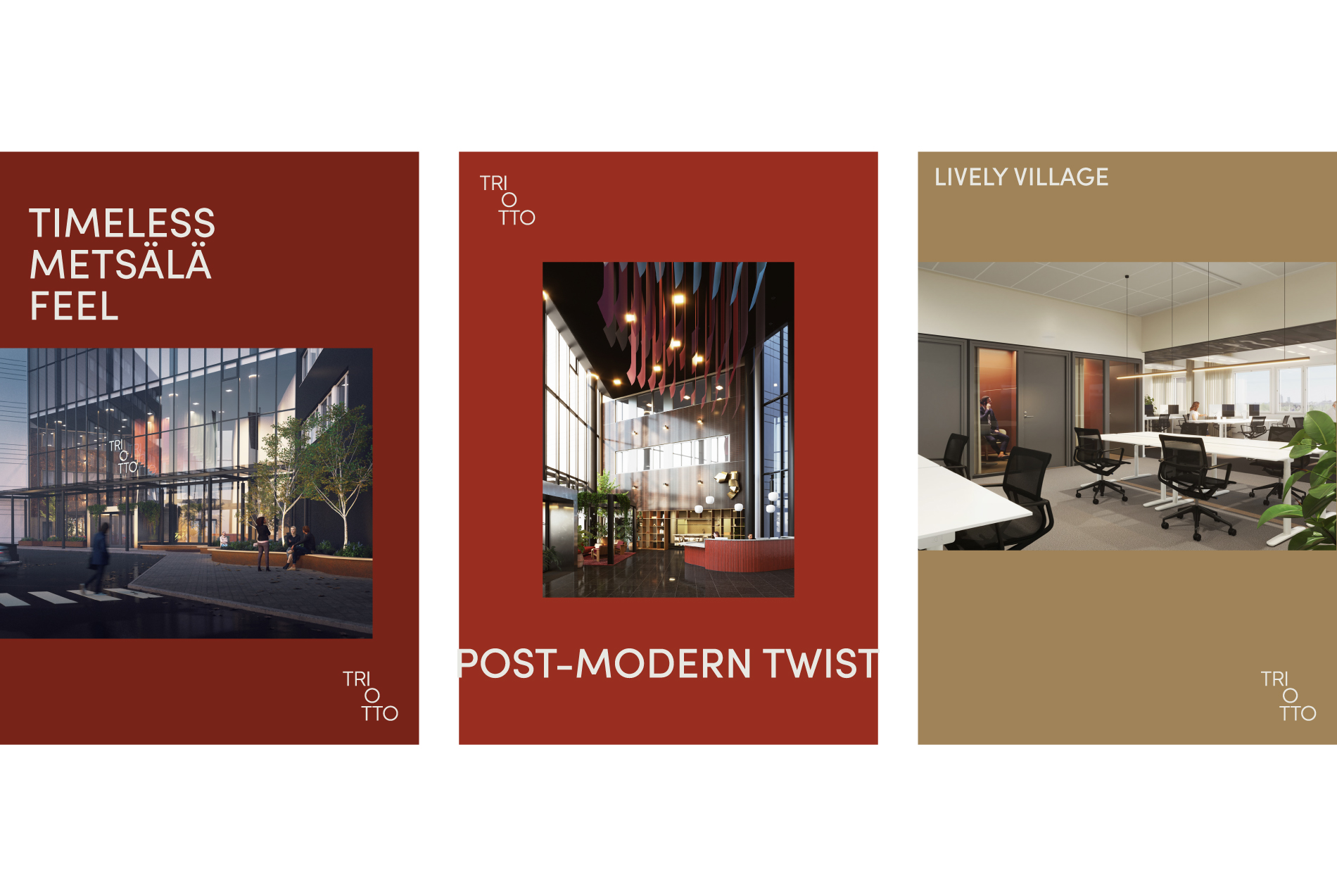 Havainnollistimme esimerkkien avulla, miten Trioton uusi identiteetti voi näkyä kiinteistön logon lisäksi myös esimerkiksi vuokrausta tukevissa julisteissa.
