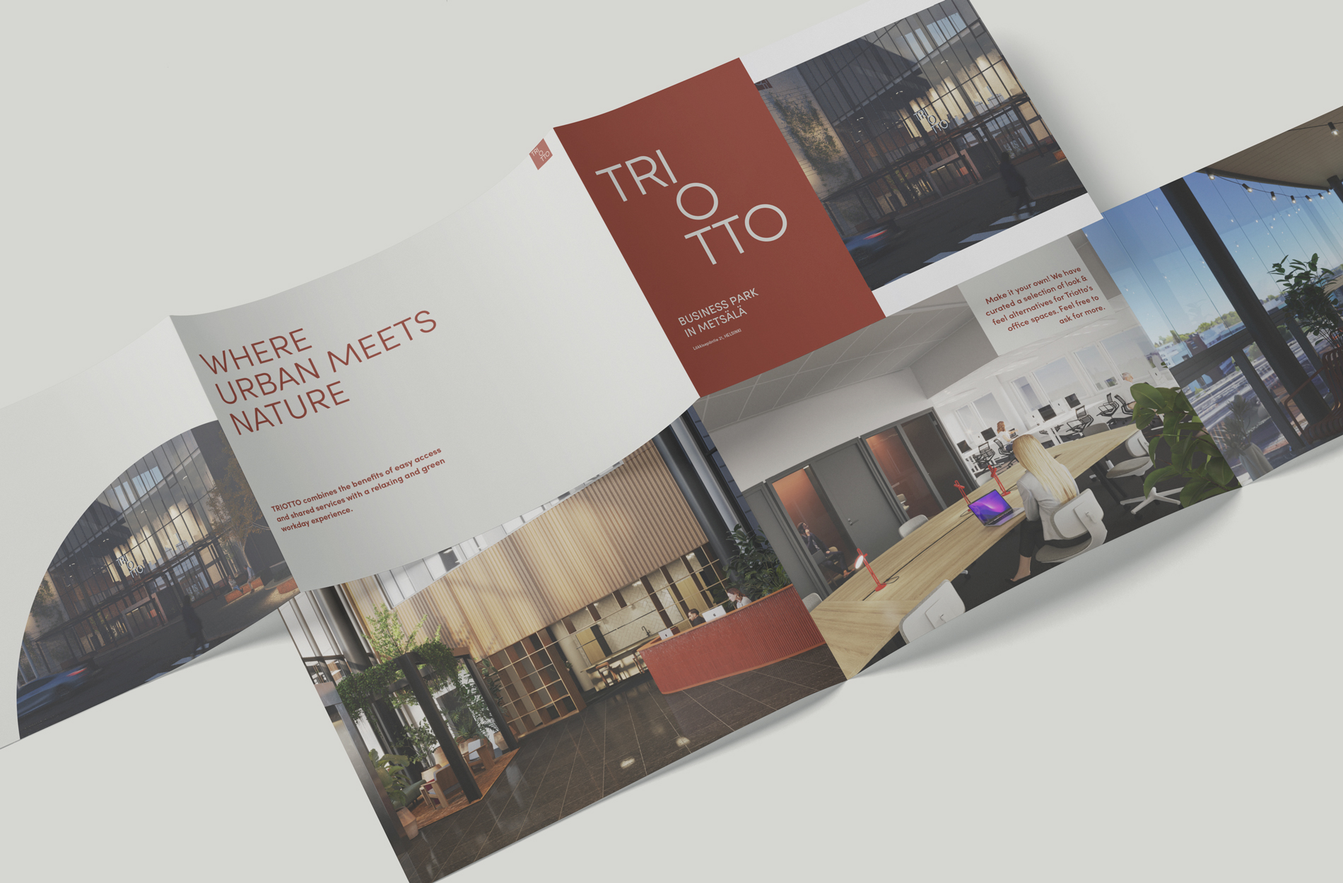Trioton uusi konsepti ei ole jäänyt pölyttymään pöytälaatikkoon: se näkyy uudistuneen kiinteistön lisäksi suomen- ja englanninkielisissä esitteissä sekä Trioton uusilla verkkosivuilla. Vastasimme esitteiden teksteistä, kuvituksesta ja taitosta sekä verkkosivujen visuaalisesta ilmeestä. Verkkosivut tuotti Micromedia.