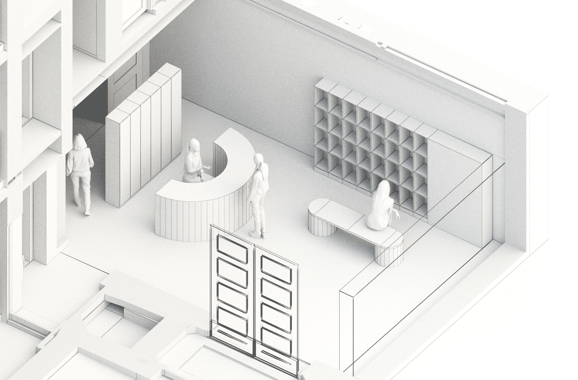 Rune & Berg Designin tuottama 3D-visualisointi aulan tilamuutoksesta.