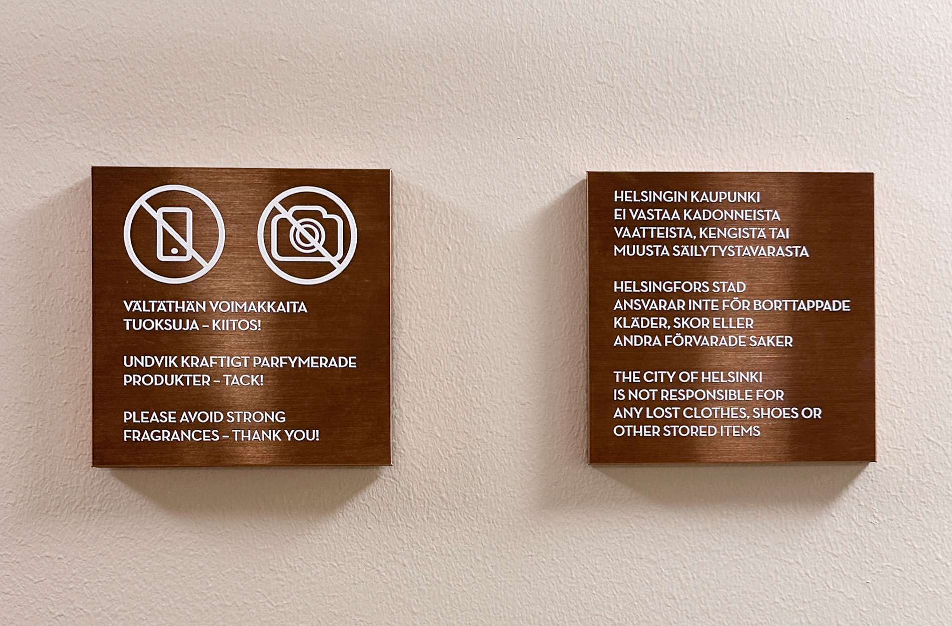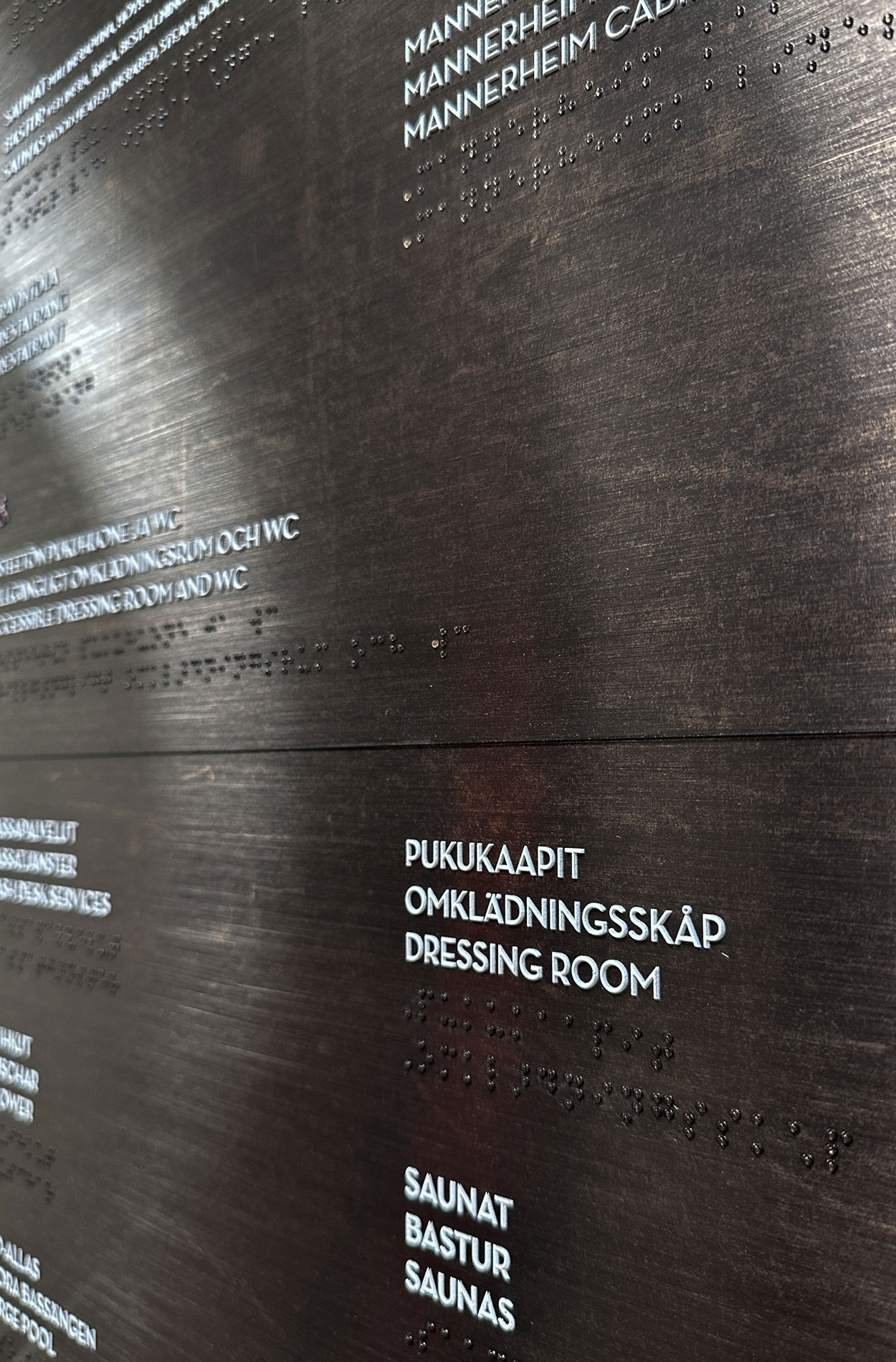 Opasteiden materiaaleiksi valikoituivat arvokkaat, arkkitehtuuria kunnioittavat antiikkimessinki ja lämpösaarni. Opasteiden sisältö toteutettiin kohokirjaimin ja pistekirjoituksella, jotta uimahallissa asiointi on mahdollisimman selkeää ja yhdenvertaista kaikille.